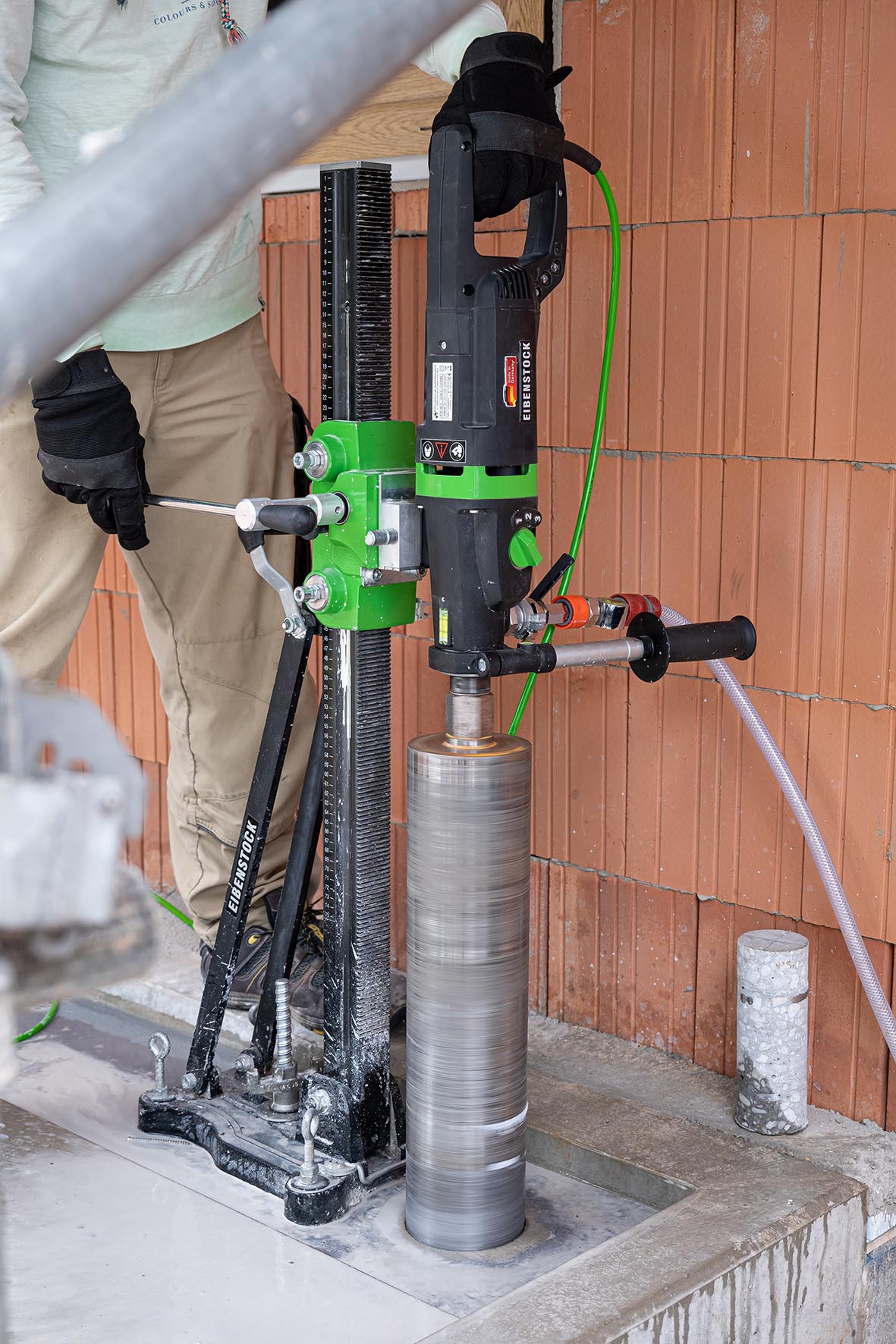 Svestrana i robusna dijamantna bušilica s postoljem, pogodna za bušenje mokro i suho u betonu, prirodnom kamenu i cigli — sa sustavom za glatki start i precizno namještanje.